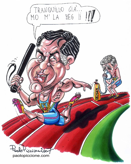la staffettaQuesta vignetta la disegnai per una rivista mensile quando Manganelli divenne capo della polizia, succedendo a Gianni De Gennaro. Ho conosciuto Manganelli di persona, e quelle pochissime volte che ho avuto modo di parlarci, si è sempre posto in maniera umile, garbata e senza “piedistallo”. E, da quel che mi scrisse in una lettera, dopo aver visto il mio secondo libro – “Euronomicon, il libro dei morti dell’euro” – apprezzava la mia satira.